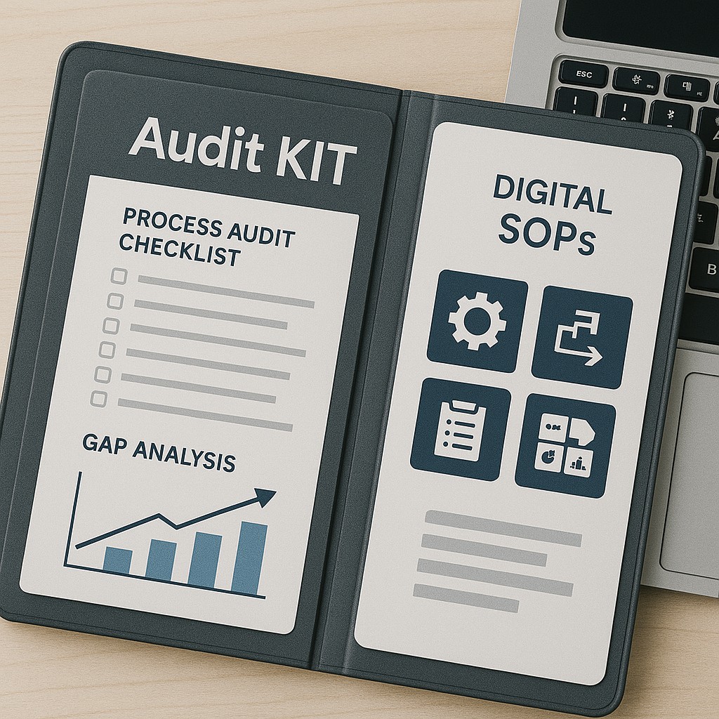 Before you can optimize, you need clarity. The Audit Accelerator Kit helps you dissect your internal operations across marketing, sales, HR, and service delivery — using digital worksheets, process mapping tools, and SOP audits.